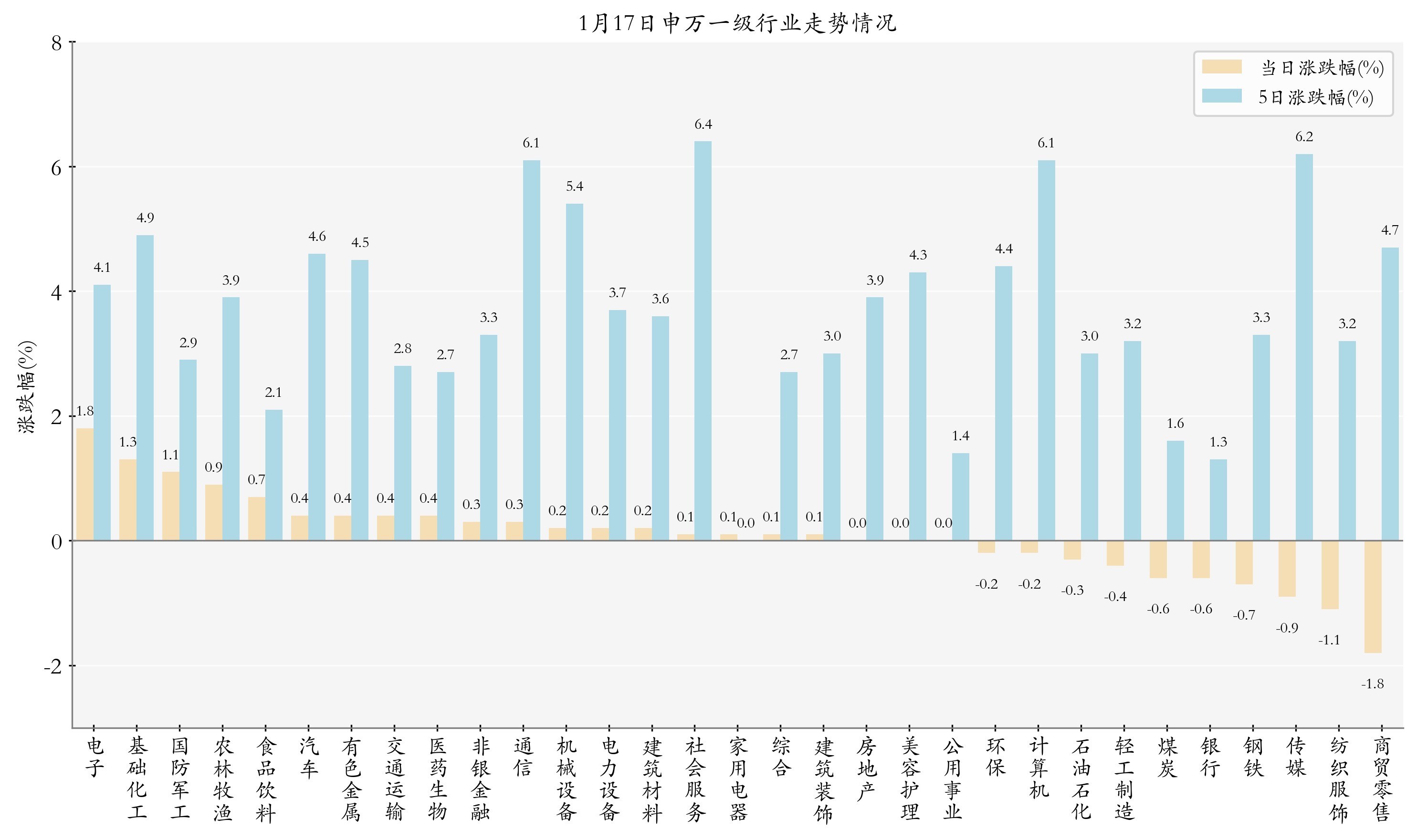 统计今日全部申万一级行业涨跌幅情况,电子、基础化工与国防军工今日走势排名靠前,日涨跌幅分别为1.77%、1.31%与1.1%,商贸零售、纺织服饰与传媒的走势排名靠后,日涨跌幅分别是-1.78%、-1.11%与-0.91%;近5个交易日社会服务、传媒与计算机的走势排名靠前,近5日涨跌幅分别为6.39%、6.16%与6.14%,家用电器、银行与公用事业的走势排名靠后,近5日涨跌幅分别为0.03%、1.31%与1.36%。