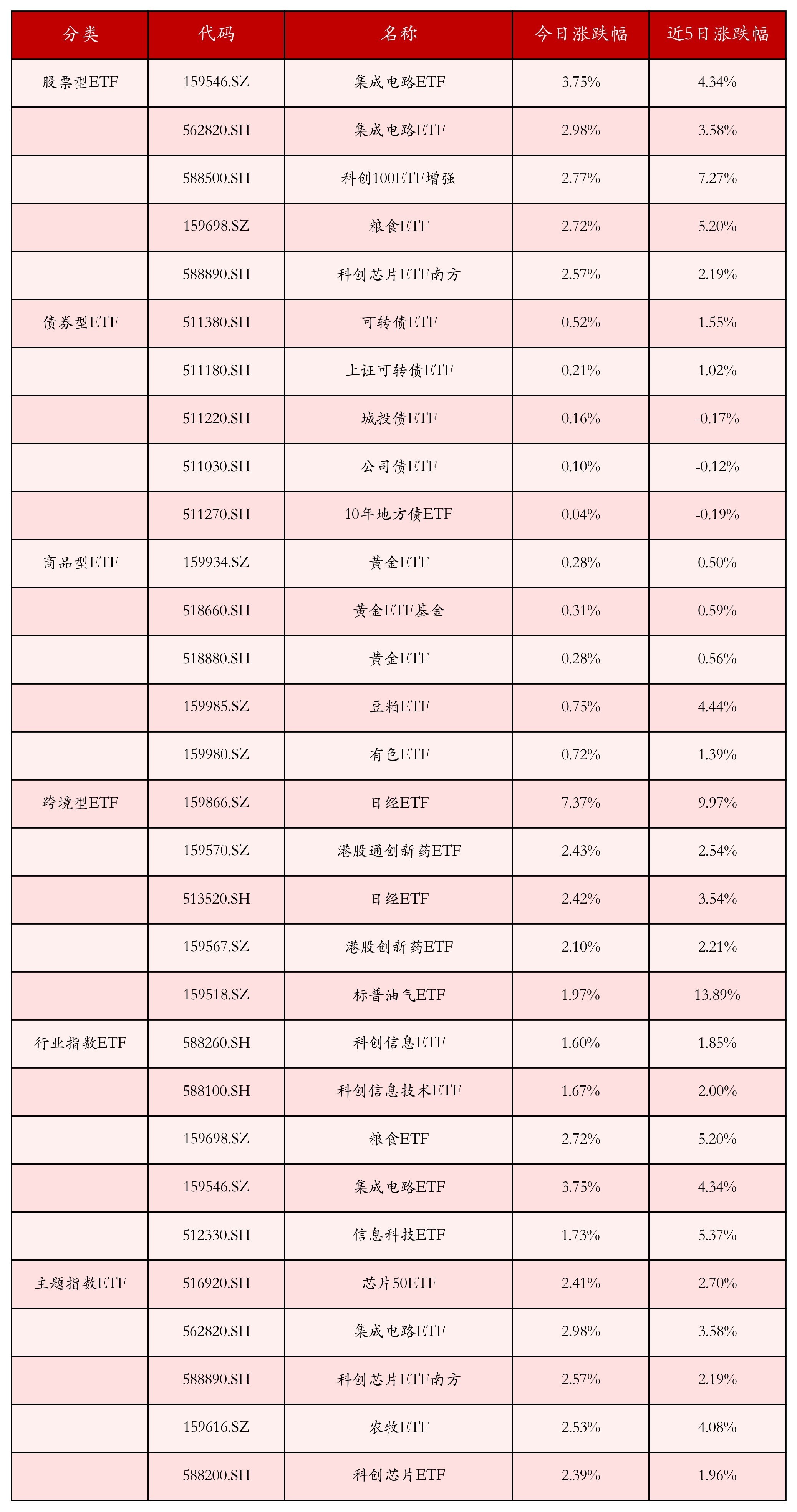 从不同投资种类、行业、主题的ETF产品中找出今日走势行情排名前5的ETF基金,今日涨幅靠前的ETF产品如下表所示。股票型ETF中涨跌幅排名前3位的ETF产品分别为集成电路ETF(159546.SZ)、集成电路ETF(562820.SH)和科创100ETF增强(588500.SH),今日收益率分别为3.75%、2.98%和2.77%。