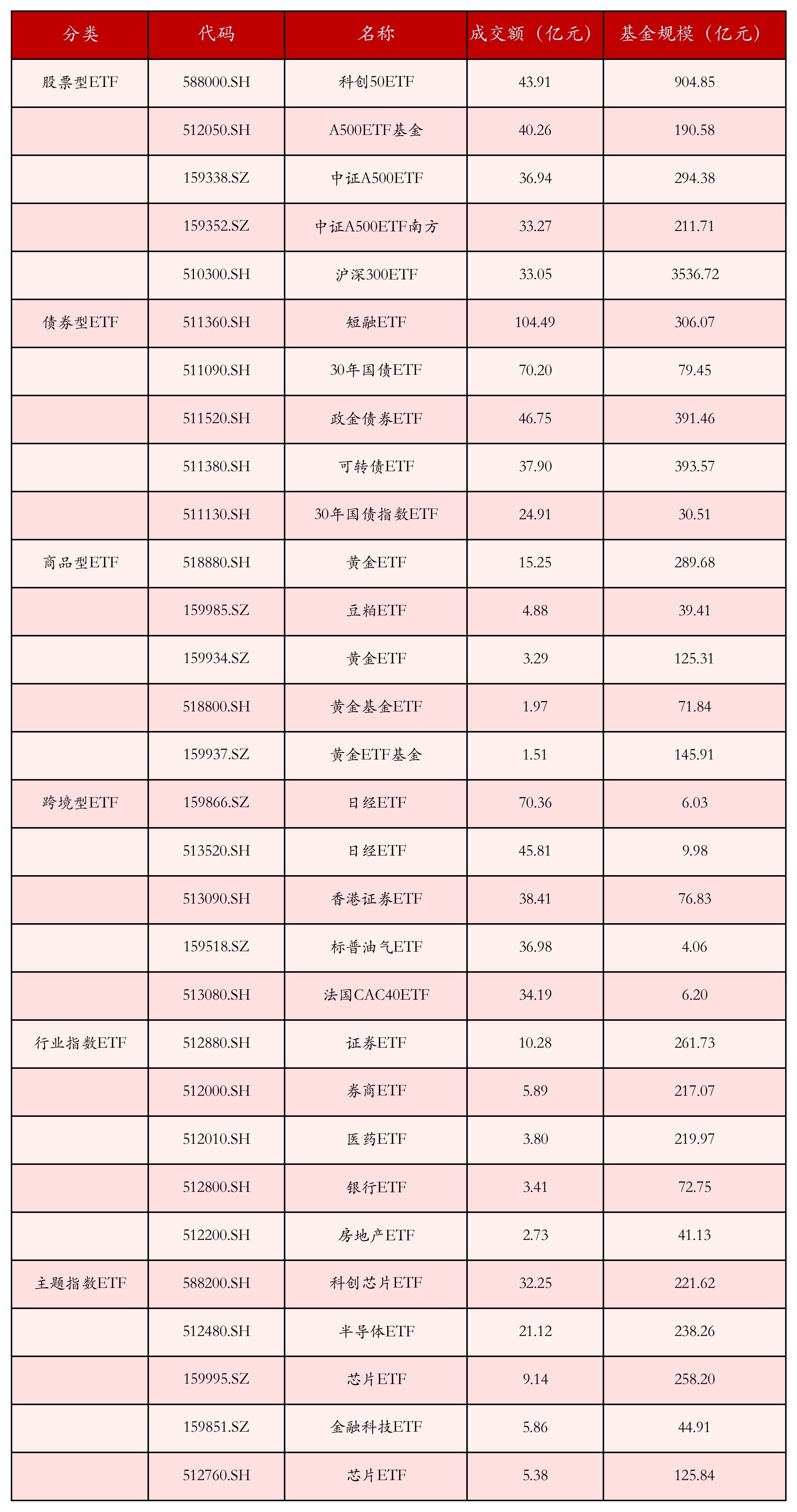 基于成交额对各类ETF今日的成交情况进行统计,成交额靠前的ETF产品如下表所示。股票型ETF中成交额排名前3位的ETF产品分别为科创50ETF(588000.SH)、A500ETF基金(512050.SH)和中证A500ETF(159338.SZ),今日成交额分别为43.91亿元、40.26亿元和36.94亿元。