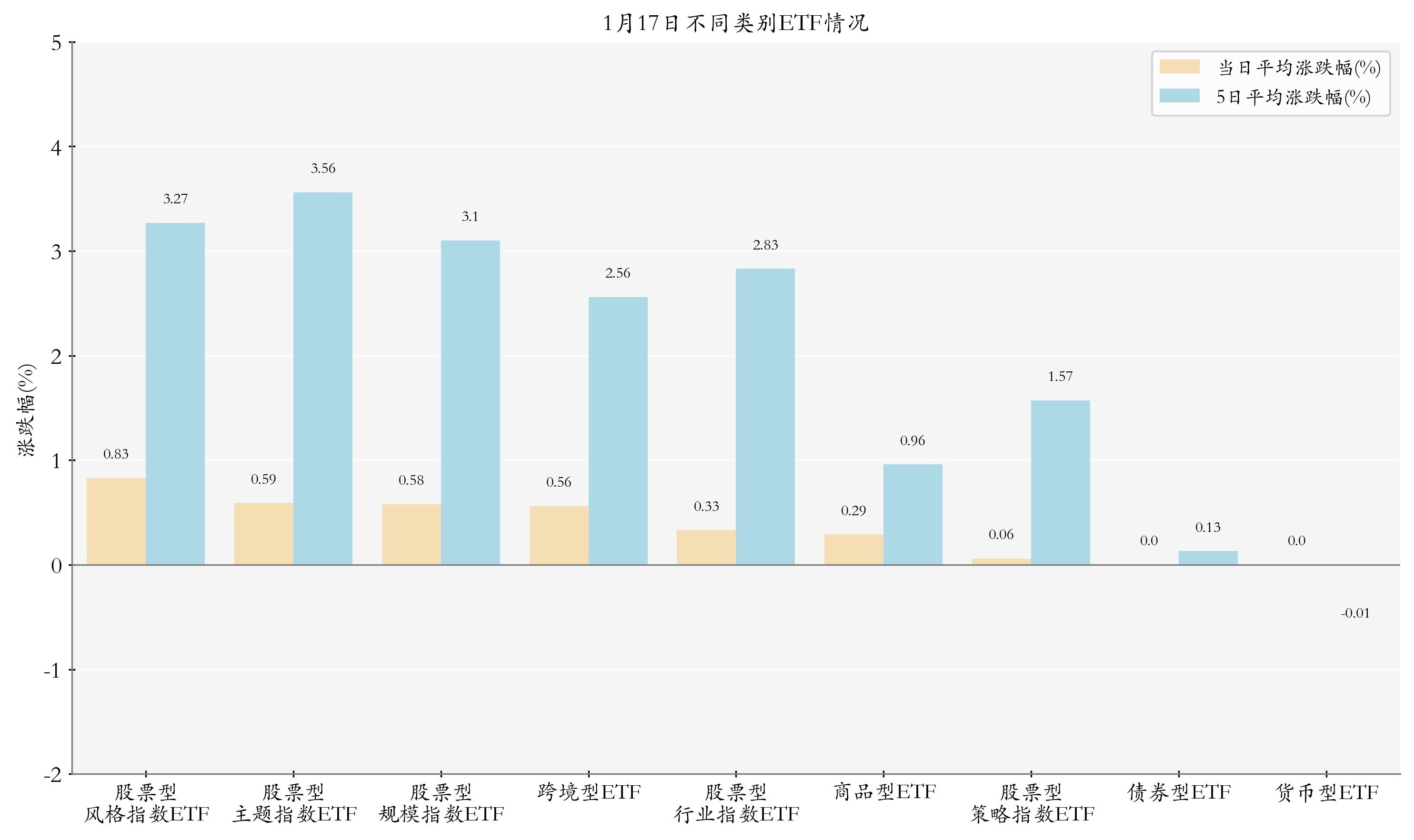 根据ETF基金的投资范围,将ETF基金划分为股票型规模指数ETF、股票型行业指数ETF、股票型策略指数ETF、股票型风格指数ETF、股票型主题指数ETF、债券型ETF、商品型ETF、货币型ETF、跨境ETF,今日股票型风格指数ETF表现最优,该类ETF的平均涨跌幅为0.83%;债券型ETF的表现最差,该类ETF的平均涨跌幅为-0.00%。
